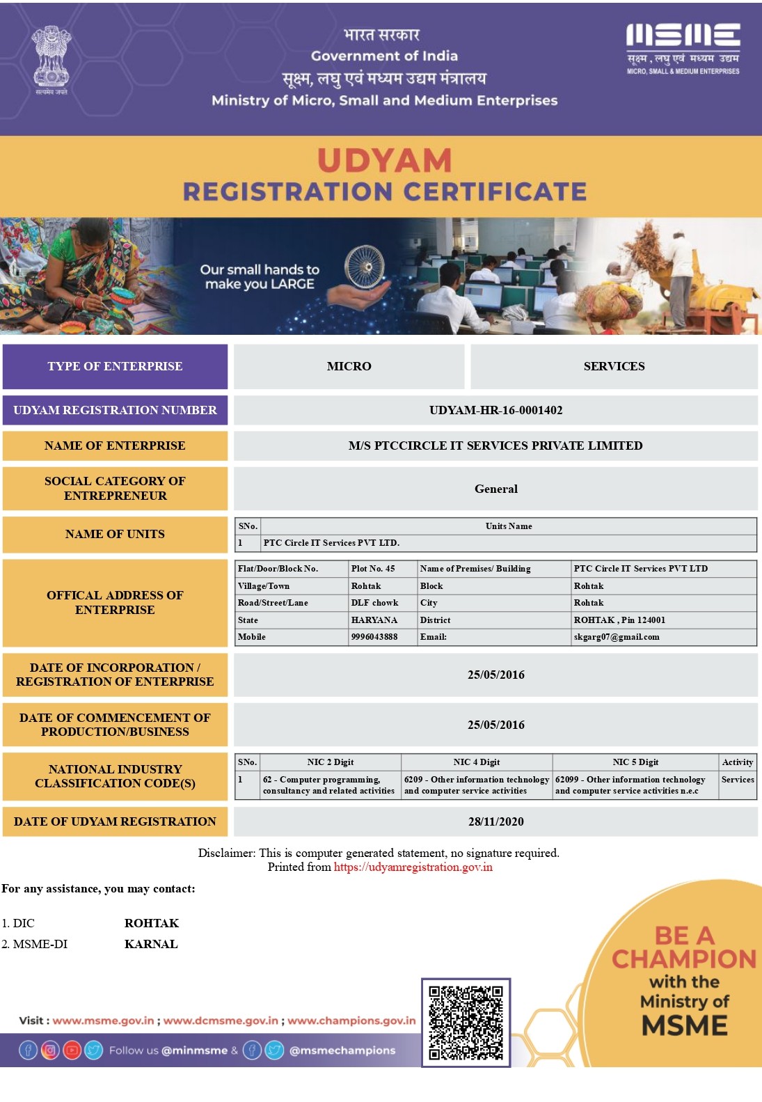 Recognized. Registered. Ready to Scale. PTC Circle IT Services Pvt Ltd is now officially registered under Udyam (MSME), Government of India, strengthening our foundation of compliance, transparency, and sustainable growth. Alongside our association with NASSCOM and alignment with national initiatives such as Startup India, this milestone reinforces our position within India’s trusted technology and innovation ecosystem—enabling us to deliver scalable, future-ready IT and education solutions with confidence.
